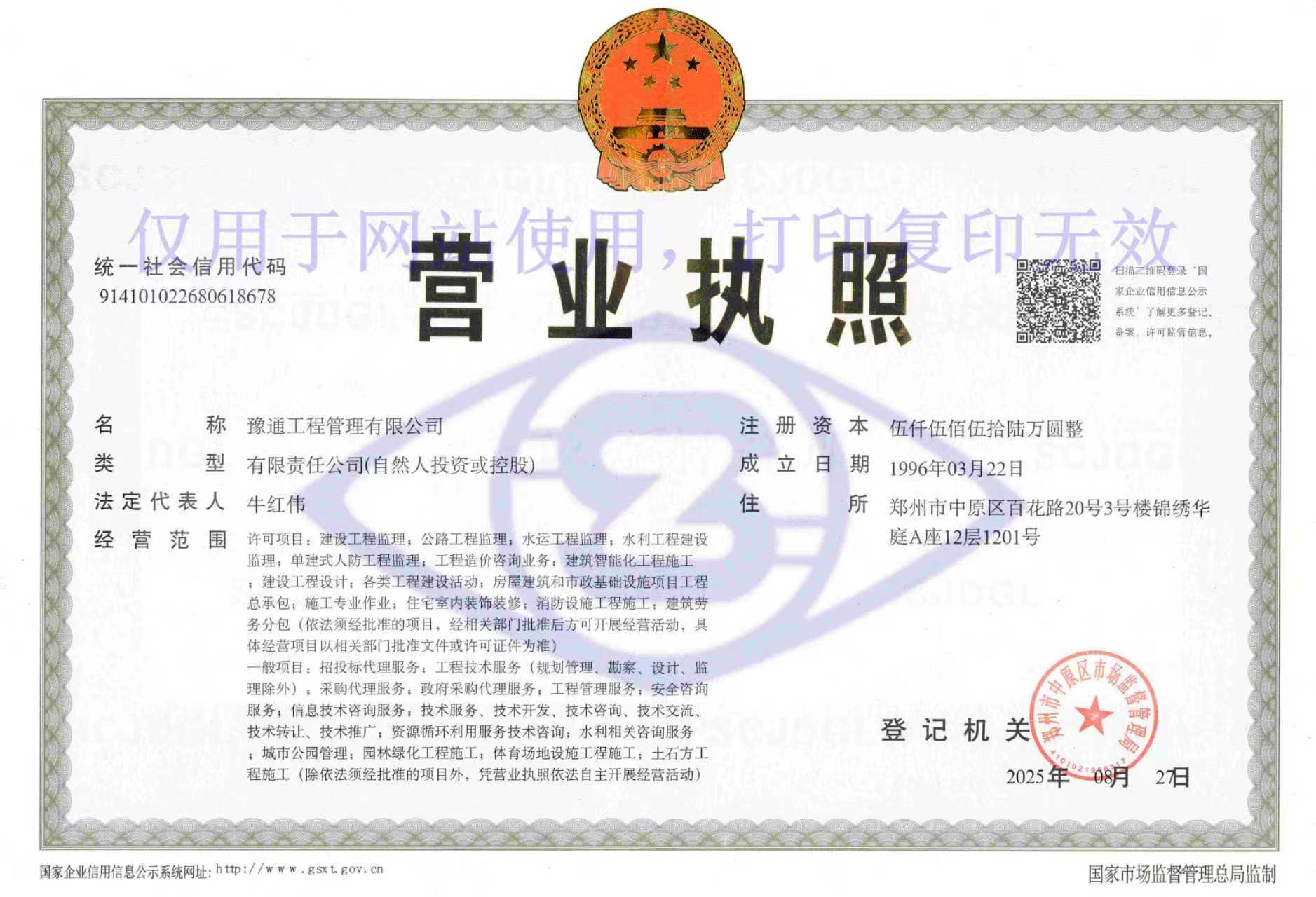 豫通工程管理有限公司(原鄭州市豫通市政公用工程監(jiān)理有限公司),成立于1996年,企業(yè)可提供工程監(jiān)理,工程招標(biāo)代理,政府采購(gòu)代理,工程造價(jià)咨詢(xún);工程項(xiàng)目管理;建設(shè)工程項(xiàng)目咨詢(xún)服務(wù);全過(guò)程工程咨詢(xún)服務(wù);建筑領(lǐng)域內(nèi)的技術(shù)開(kāi)發(fā)、技術(shù)轉(zhuǎn)讓、技術(shù)咨詢(xún)及技術(shù)服務(wù)等相關(guān)服務(wù)。現(xiàn)擁有工程監(jiān)理綜合資質(zhì),建筑裝修裝飾工程施工資質(zhì),同時(shí)開(kāi)展招標(biāo)代理及工程造價(jià)咨詢(xún)業(yè)務(wù);現(xiàn)為中國(guó)建設(shè)監(jiān)理協(xié)會(huì)會(huì)員單位,守合同重信用企業(yè),河南省監(jiān)理企業(yè)二十強(qiáng)(建筑業(yè)骨干企業(yè)),河南省建設(shè)監(jiān)理協(xié)會(huì)副秘書(shū)長(zhǎng)單位,河南省投標(biāo)先進(jìn)單位和誠(chéng)實(shí)守信單位,河南工程咨詢(xún)行業(yè)十佳杰出單位,河南省住房和城鄉(xiāng)建設(shè)廳重點(diǎn)培育企業(yè),河南省信用評(píng)價(jià)優(yōu)秀等級(jí)監(jiān)理企業(yè),高新技術(shù)企業(yè),連續(xù)多年被評(píng)為省先進(jìn)監(jiān)理企業(yè)和誠(chéng)信建設(shè)先進(jìn)企業(yè)。