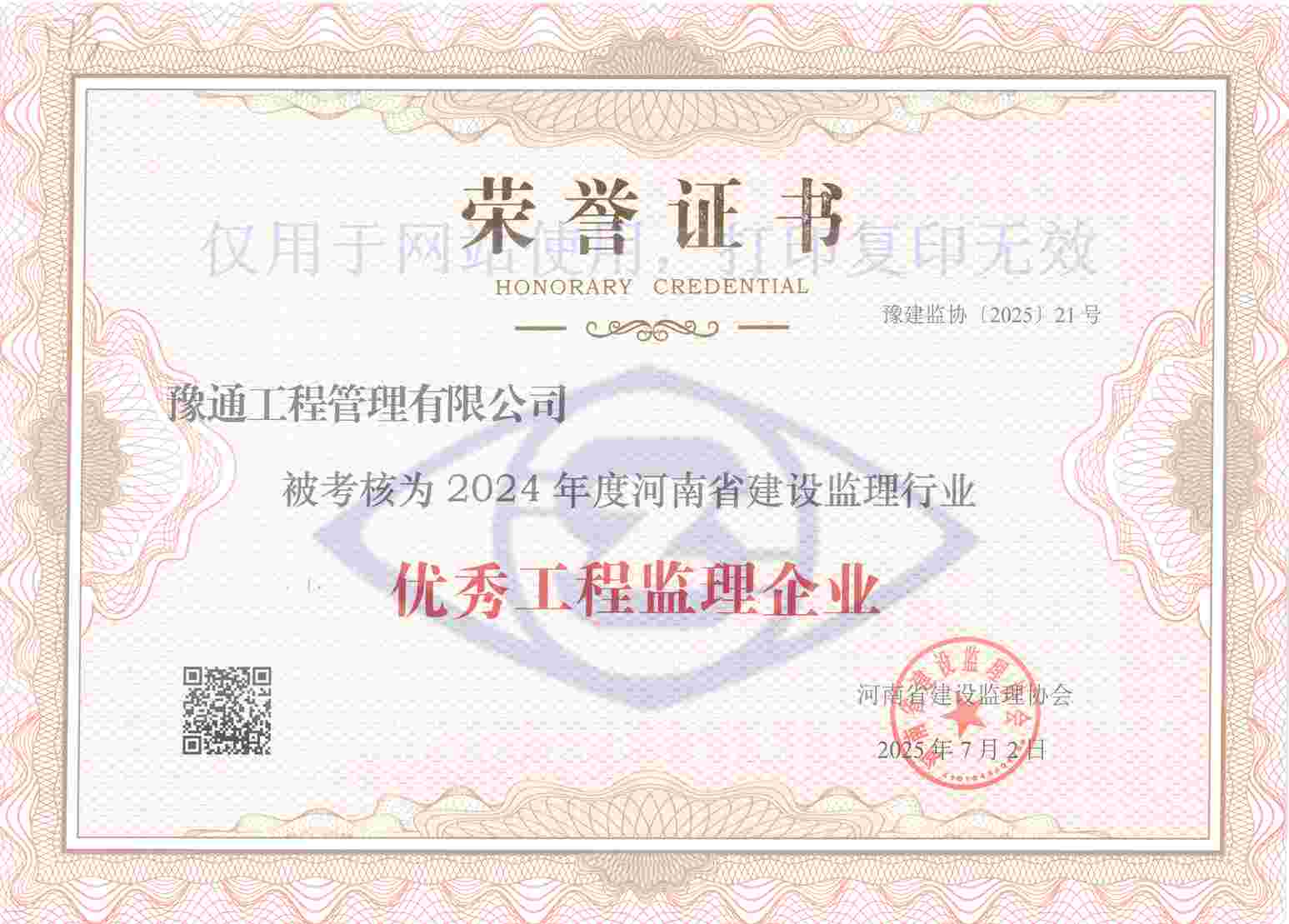 熱烈祝賀我公司榮獲“2024年度優(yōu)秀工程監(jiān)理企業(yè)”稱號(hào)2025/07/21 16:35